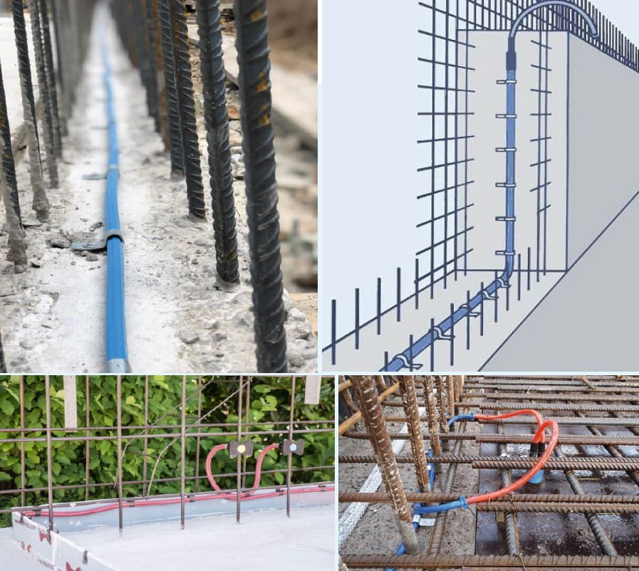Gjatë fazës fillestare të ndërtimit, ne vendosim tuba specialë injektimi direkt në fuga dhe lidhjet e betonit, duke krijuar një rrjet të fshehur që mund të përdoret më vonë. Nëse pas disa vitesh ka rrjedhje të mëvonshme për shkak të lëvizjeve të tokës, këta tuba na mundësojnë të bëjmë injektime të reja në mënyrë të shpejtë, pa qenë nevoja të kërkojmë për pikën e dobët.